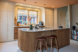 In Haps hebben we onlangs een moderne, greeploze keuken gerealiseerd, die strak en stijlvol oogt. De combinatie van twee verschillende Fenix-kleuren zorgt voor een subtiel contrast, terwijl het materiaal vingerproof is en daarmee extra onderhoudsvriendelijk. Het keukenblad is uitgevoerd in Dekton Nebbia, een luxe en robuust materiaal met een verfijnde uitstraling. Dit ontwerp combineert functionaliteit en design op een naadloze manier, waardoor de keuken niet alleen praktisch in gebruik is, maar ook een echte eyecatcher in de woning.